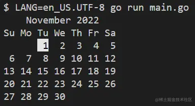 $ echo $LANG zh_CN.UTF-8 $ LANG=en_US.UTF-8 go run main.go
