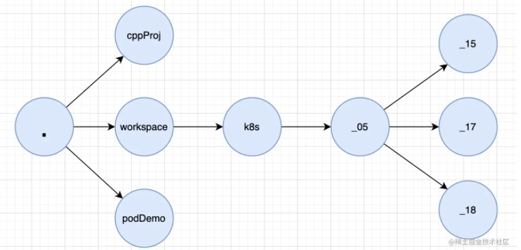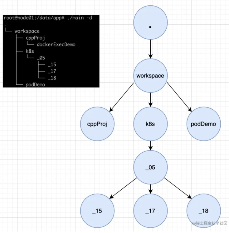 _15节点属于第一个节点,因此首先添加前缀 "├──"; 前缀结果为: "├──"_15节点的父亲_05没有右兄弟,因此继续添加前缀 " "; 前缀结果为:" ├──"_05节点的父亲k8s有右兄弟,因此继续添加前缀 "│ "; 前缀结果为:"│ ├──"k8s节点的父亲workspace没有右兄弟,因此继续添加前缀 " "; 前缀结果为:" │ ├──"- 最终