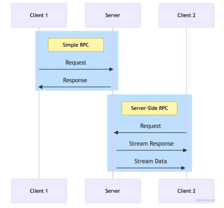 在这里我们创建了两个 RPC 服务,分别是负责上报状态的 Simple RPC ReportStatus 以及 Server-Side RPC AssignTask。Simple RPC 和 Server-Side RPC 的区别如下图所示,主要区别在于 Server-Side RPC 可以从通过流(Stream)向客户端(Client)主动发送数据,而 Simple RPC 只能从客户端向服务端(Server)发请求。