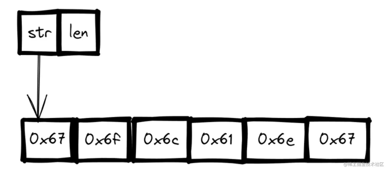 str 是指针,指向了字符串的首地址,而len则是字符串的长度,大概结构就像下面这张图一样