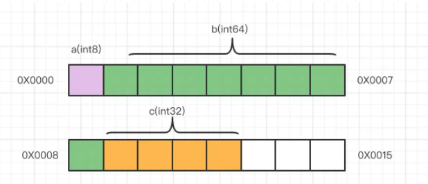 通过上面示例,我们可以看到两个结构体中3个字段类型相同,当排列顺序发生变化时,总的内存大小也会发生变化。下面我们来一起分析一下: