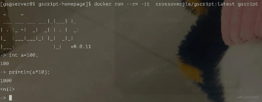 docker pull crossoverjie/gscript docker run --rm -it crossoverjie/gscript:latest gscript