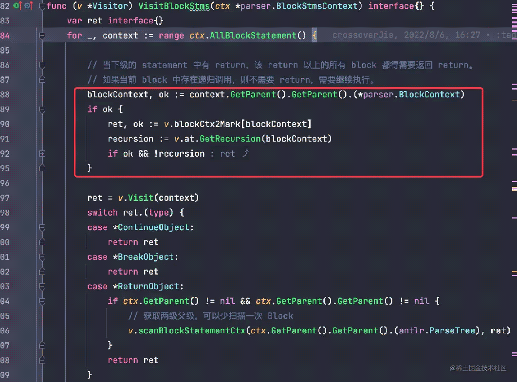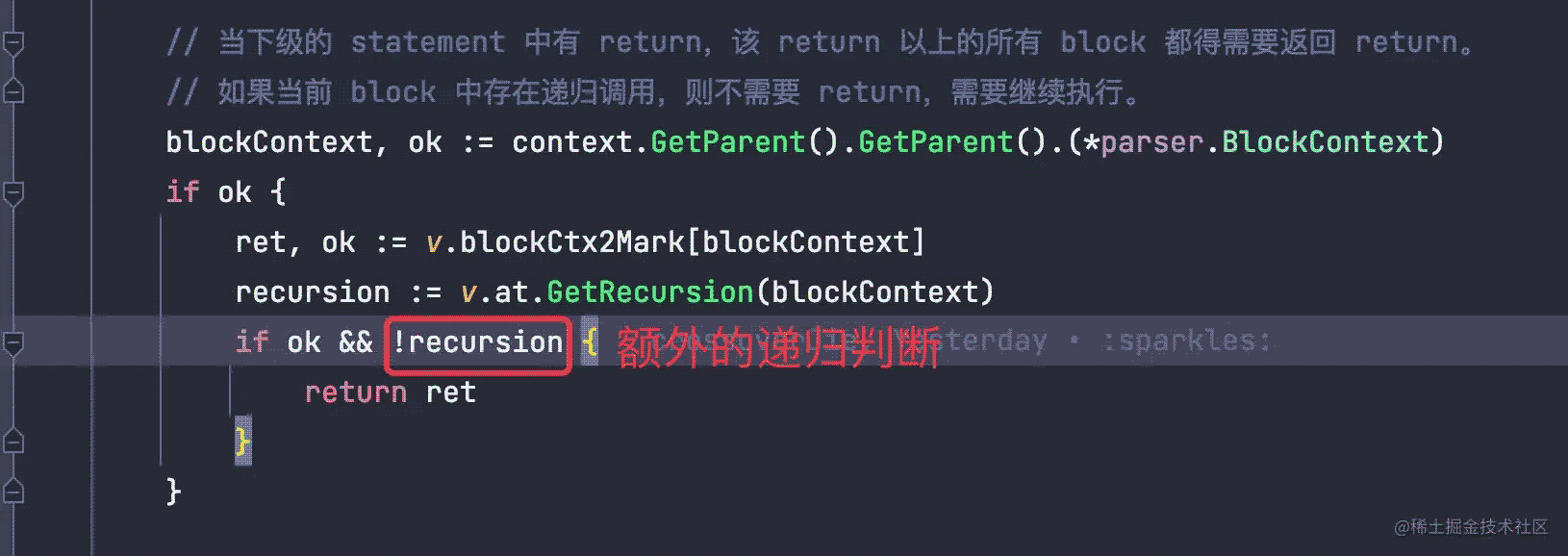 return语句处,额外多出判断当前block是否为递归调用,如果是则不能返回。