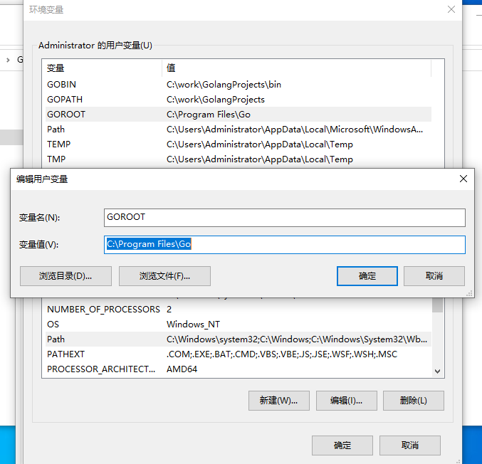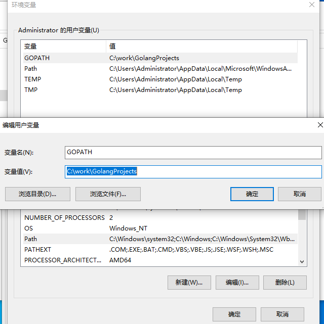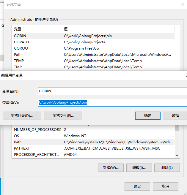 GOBIN 的配置在C:\work\GolangProjects\bin下,这样以后我们下载的exe都会放在这个目录下
