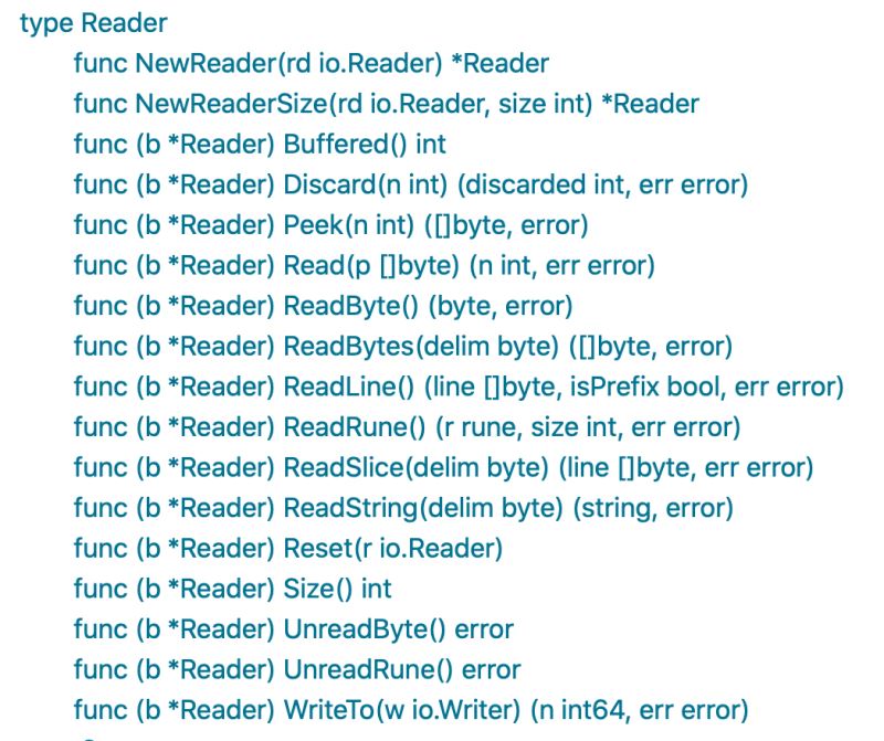 bufio.Reader封装了io, 并实现了缓冲I/O,同时它也实现了io.Reader的方法的Read方法。bufio缓冲区有默认大小是4K。