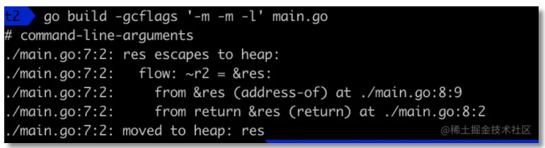 -m 会打印出逃逸分析的优化策略,实际上最多总共可以用 4 个 -m,但是信息量较大,一般用 1 个就可以了