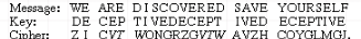 在最简单的 Vigenère 类型系统中,密钥是一个单词或短语,它可以根据需要重复多次以加密消息。如果密钥是欺骗性的,并且消息是我们被发现了,请自救,那么生成的密码将是
