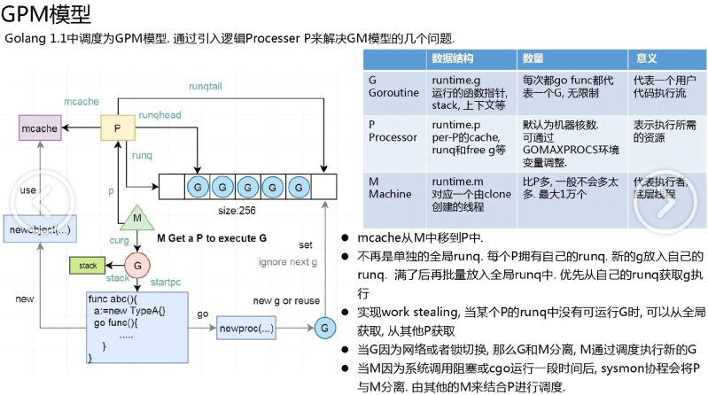 - M 结构是 Machine,系统线程,它由操作系统管理和调度的,goroutine 就是跑在 M 之上的; M 是一个很大的结构,里面维护小对象内存 cache(mcache)、当前执行的 goroutine、随机数发生器等等非常多的信息。