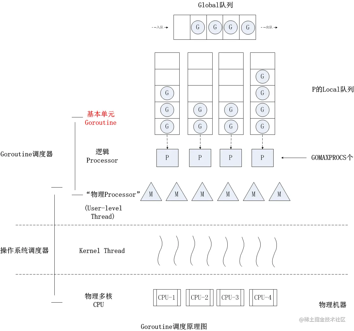 <p>Go 语言中支撑整个调度器实现的主要有 4 个重要结构,分别是 machine(简称 M )、goroutine(简称 G )、processor(简称 P )、Scheduler(简称 Sched), 前三个定义在 <code>runtime.h</code> 中,Sched 定义在 <code>proc.c</code> 中。</p>