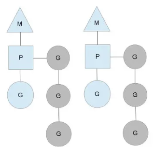 我们分别用三角形,矩形和圆形表示 Machine Processor 和 Goroutine: