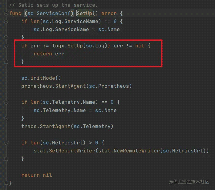 对于 logx 日志组件的启动就是在 c.SetUp() 中完成