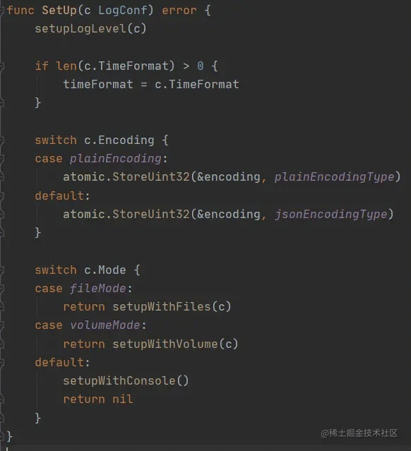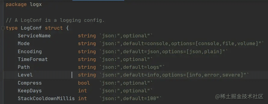 继续看到 logx.SetUp() 中的具体实现 , 函数需要传入的数据结构是这样的 LogConf