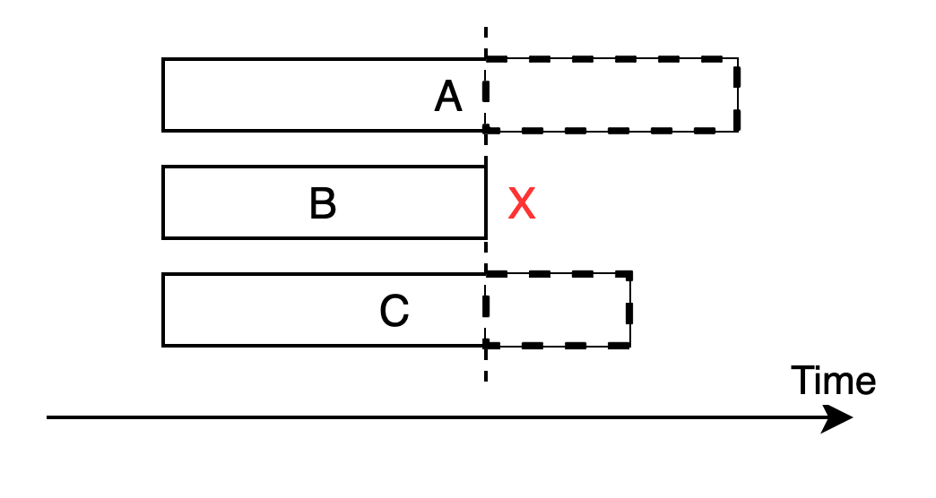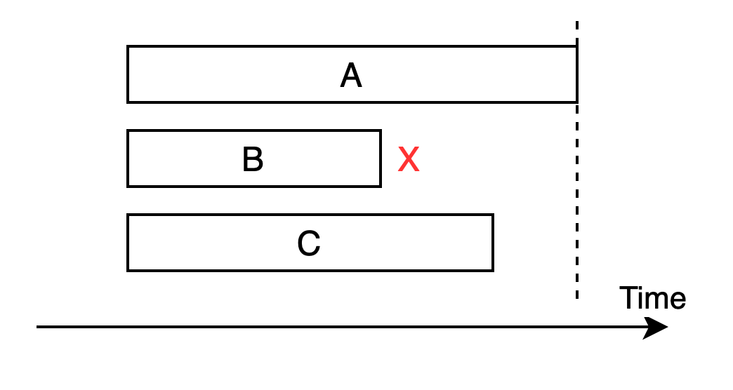 但是现实事件是不完美的,尤其是在加入了网络这一因素后,我们经常会需要处理调用失败的情况,很多情况下,并发的几个操作只要任一失败,整个处理就算失败了,但是由于WaitGroup要等所有调用都done才能返回,因此调用时间是由耗时最长的那个(不一定是失败的)决定的,如果不是失败的那个,其实就产生了资源浪费,如下图,B最先失败了,此时逻辑上已经可以返回,但是实际却等到了最长的调用-A返回了整个函数才返回: