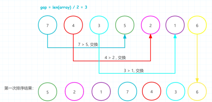 array[1...n]中,增量序列为{g1, g2, ..., gt},n>g1>g2>...>gt=1。 - 第一趟增量 g1, 所有间隔为 g1 的记录分在一组,对每组记录进行插入排序。