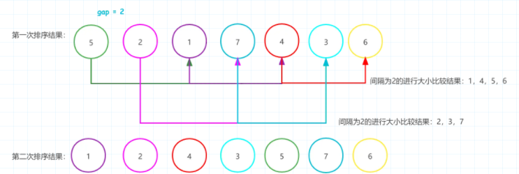 - 第二趟取增量 g2,所有间隔为 g2 的记录分在一组,对每组记录进行插入排序。