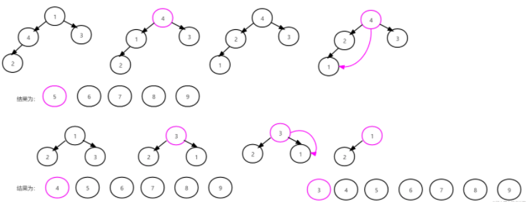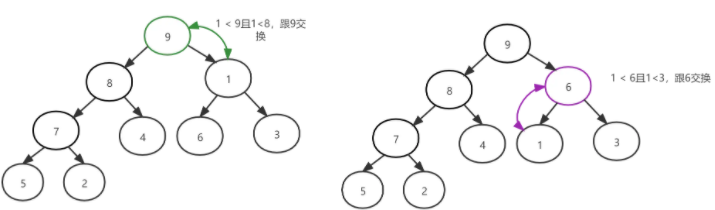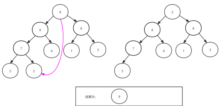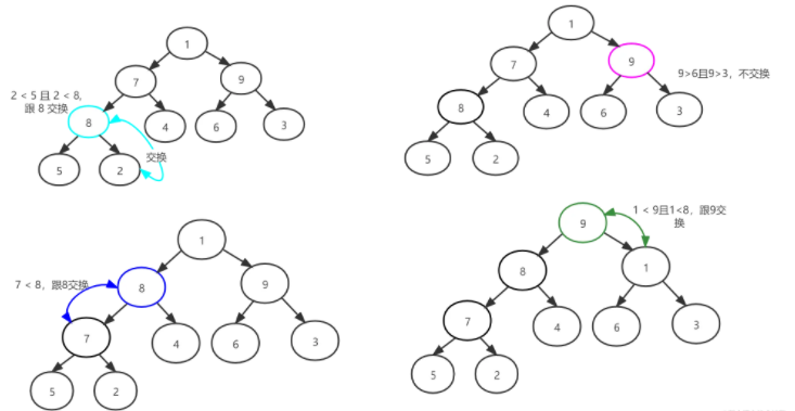 最终通过此次调整堆,得到新的堆为 [9, 8, 6, 7, 4, 1, 3, 5, 2] ,得到新的堆后开始堆排序过程
