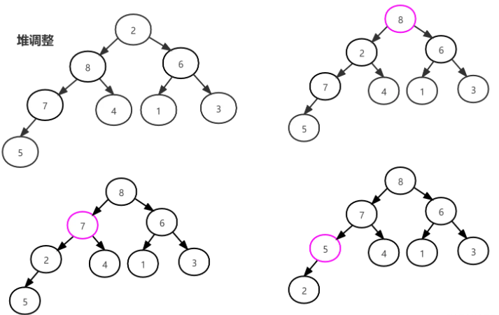 堆调整完毕,开始把新的堆顶 8 和最后一个记录 2 进行交换,然后将堆顶下沉,调整为堆,如下图所示: