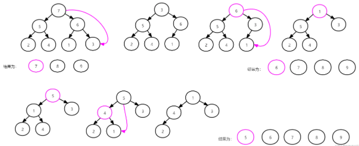 从此我们得到新的堆顶 7 ,然后把 7 跟最后一个元素 3 进行交换,7 下沉,然后堆调整,慢慢得到堆顶 6 和 堆顶5,如图所示: