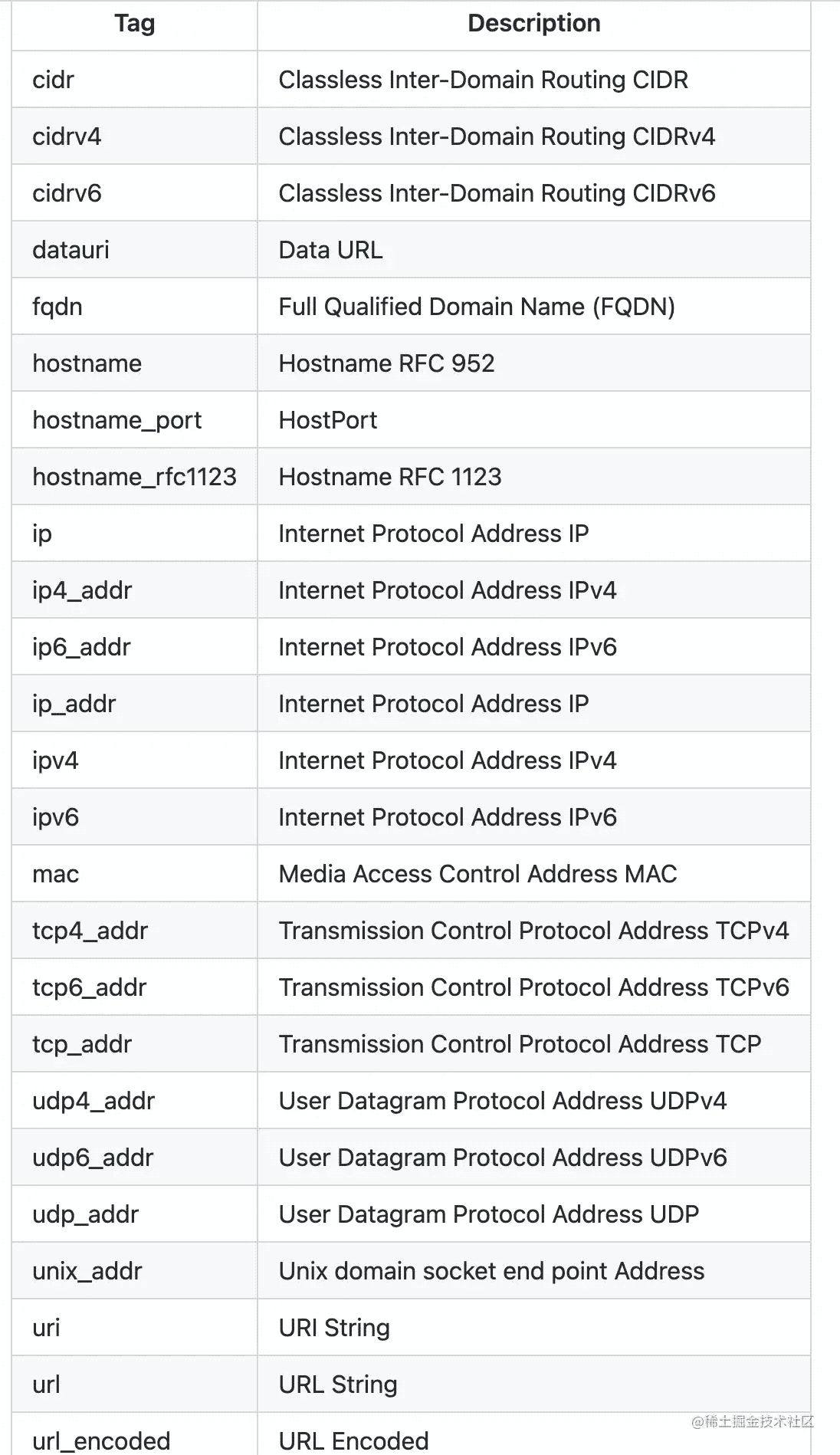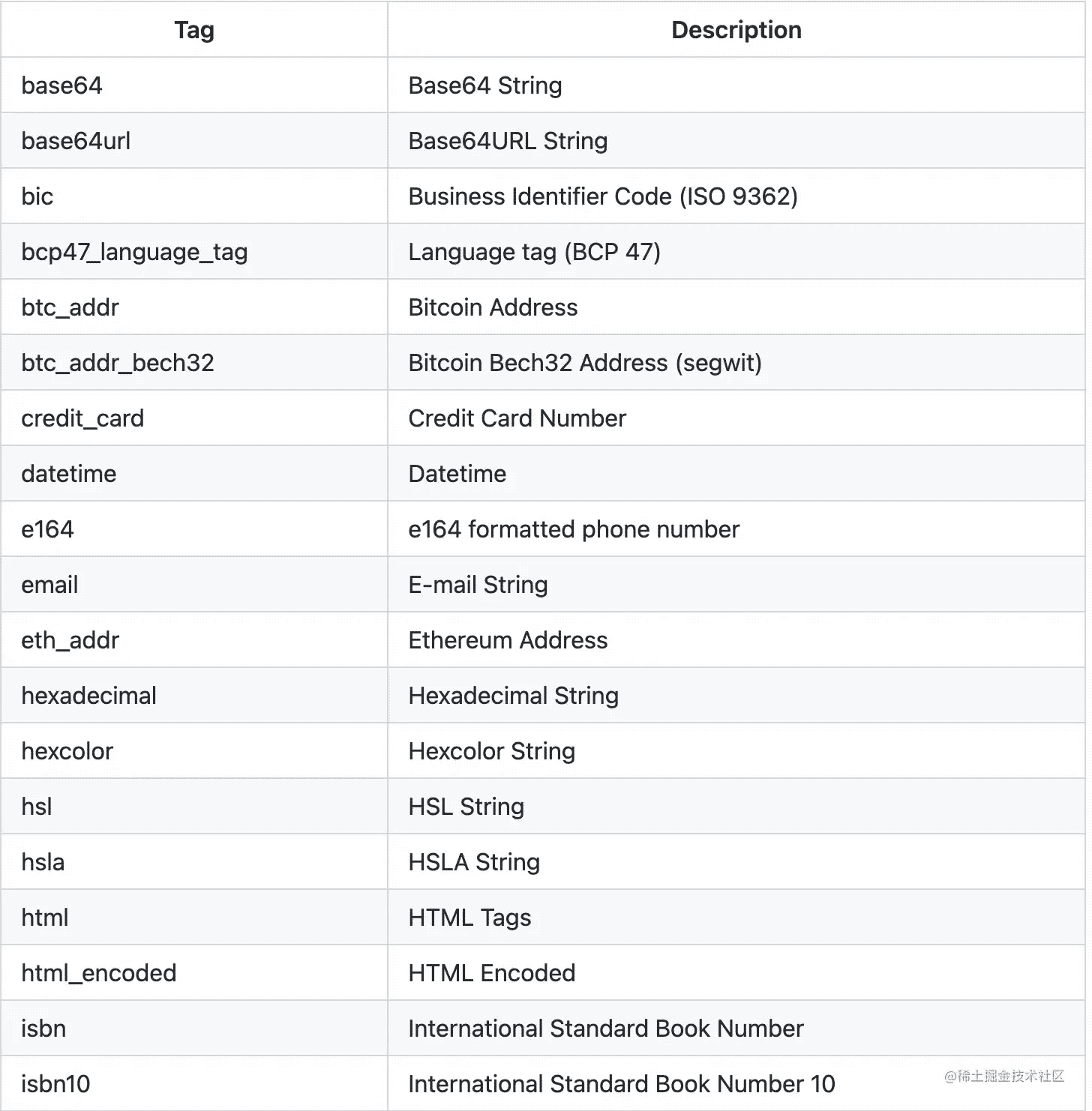 它提供了【基于 tag 对结构体以及单独属性的校验能力】。经典的 gin 框架就是用了 validator 作为默认的校验器。它的能力能够帮助开发者最大程度地减少【基础校验】的代码,你只需要一个 tag 就能完成校验。完整的文档参照 这里。