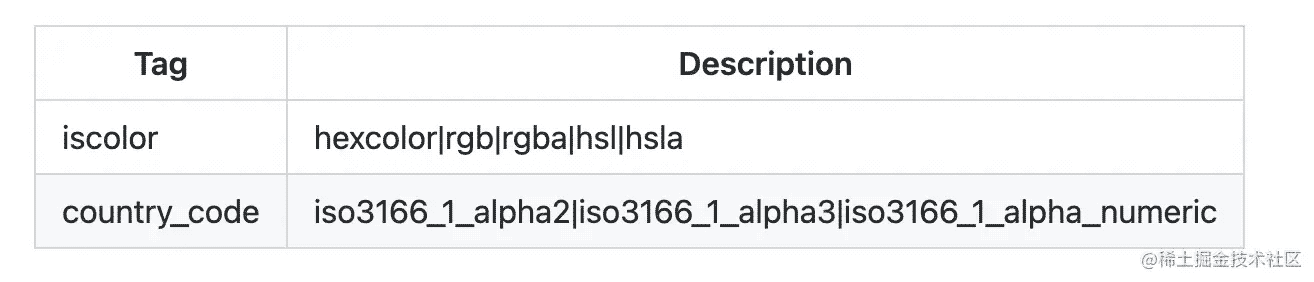 FavouriteColor string `validate:"iscolor"` // alias for 'hexcolor|rgb|rgba|hsl|hsla'