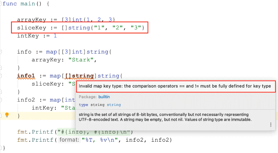 接口和结构体可作为 Key,前提是所包含的属性必须都是可以进行 == 或者 != 比较的,如果包含一个属性不可以进行 == 或者 != 比较,便不能作为 Key。
