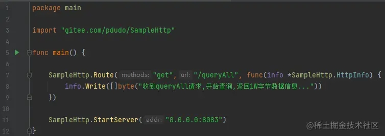我们先来使用SampleHttp编写一个最简单的web服务器,定义路由queryAll,收到后,假设将返回客户端1w字节的数据信息。