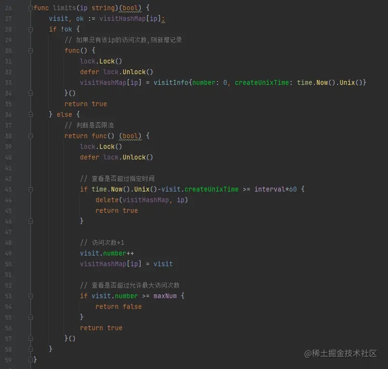 核心存储,我们可以选择go map,其中key为ip,value为结构体,该结构体包含访问次数和创建间戳。