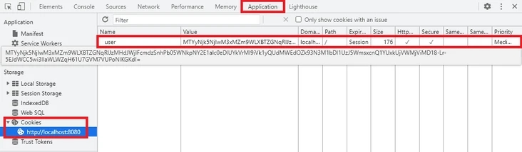 首先使用浏览器访问localhost:8080/set_cookie,这时可以在 Chrome 开发者工具的 Application 页签中看到 cookie 内容: