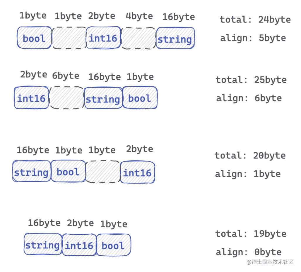 不同类型有着不同的内存对齐方式,总体上都是以最小可容纳单位进行对齐的,这样可以在兼顾以最小的内存空间填充来换取内存计算的高效性。