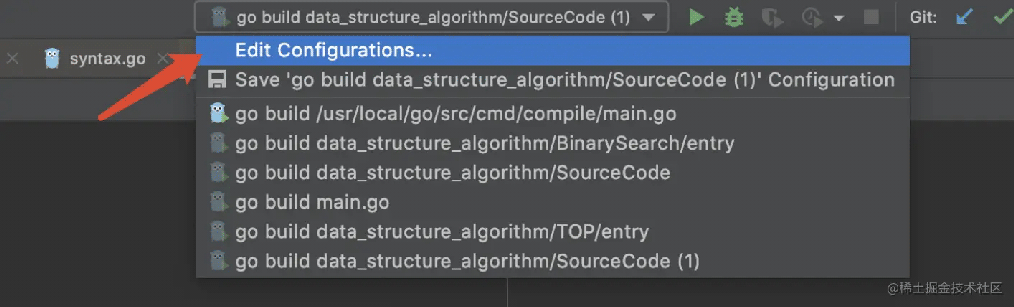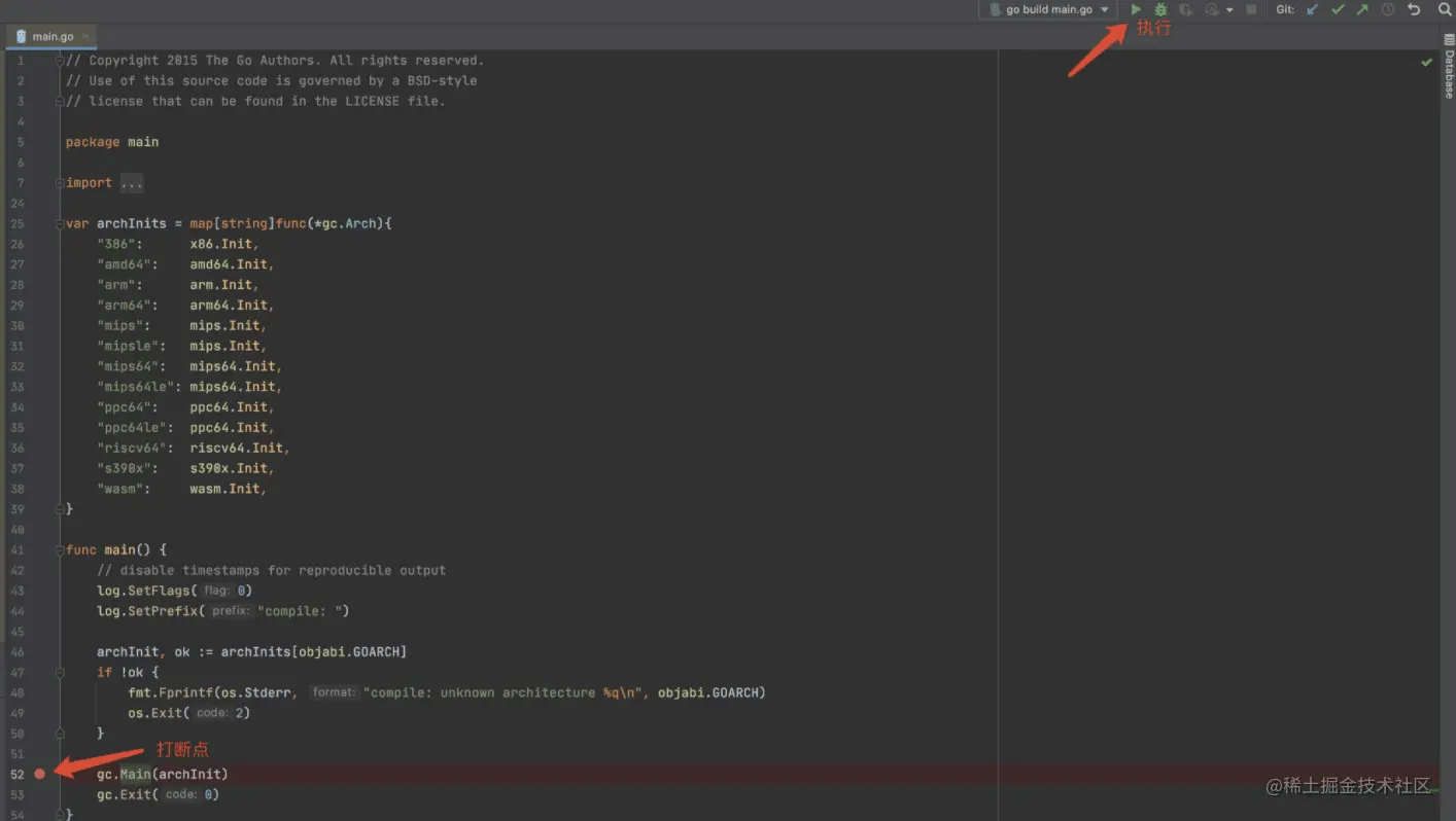 下边以调试Go编译的入口文件为例