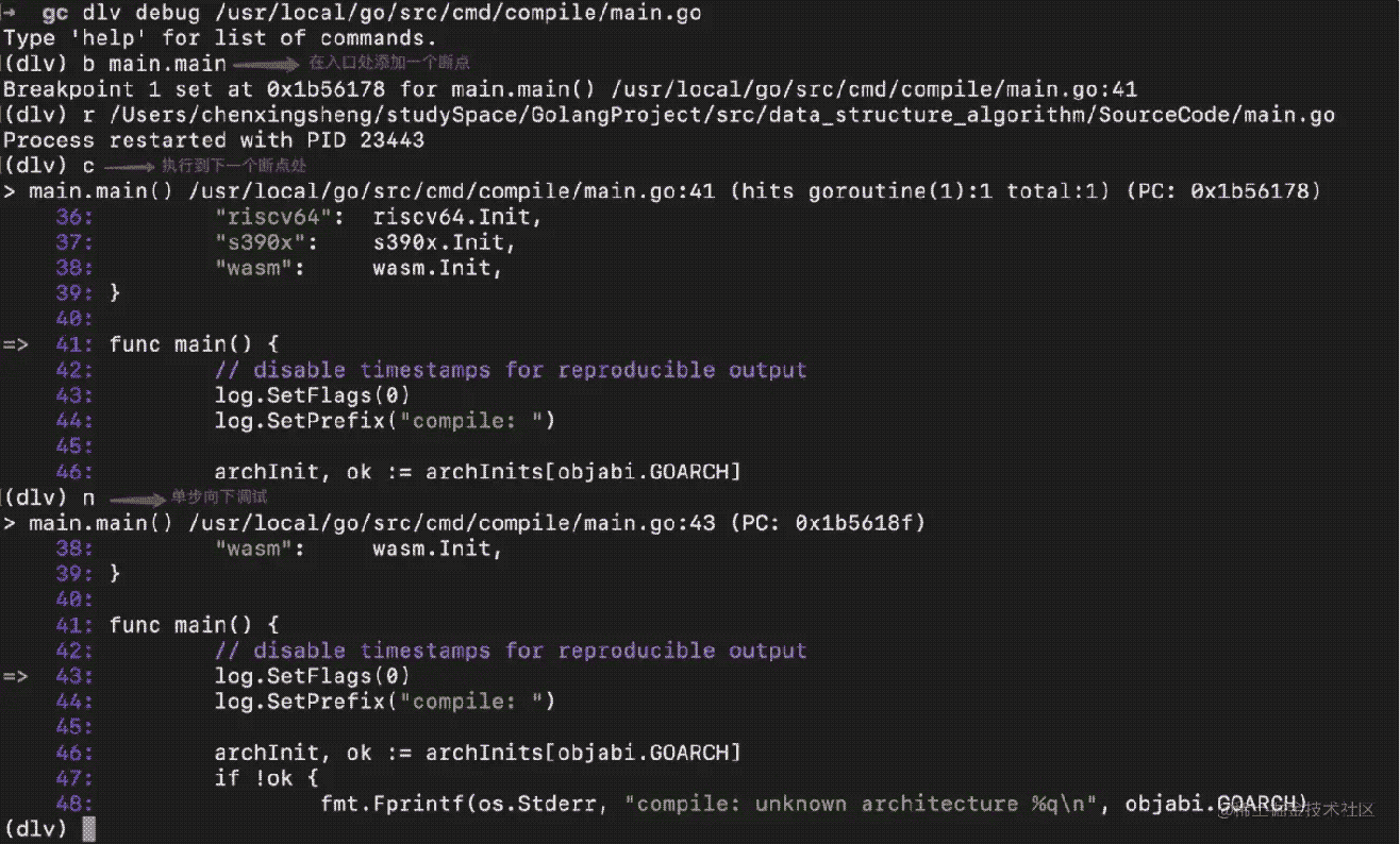 $ gc dlv debug /usr/local/go/src/cmd/compile/main.go