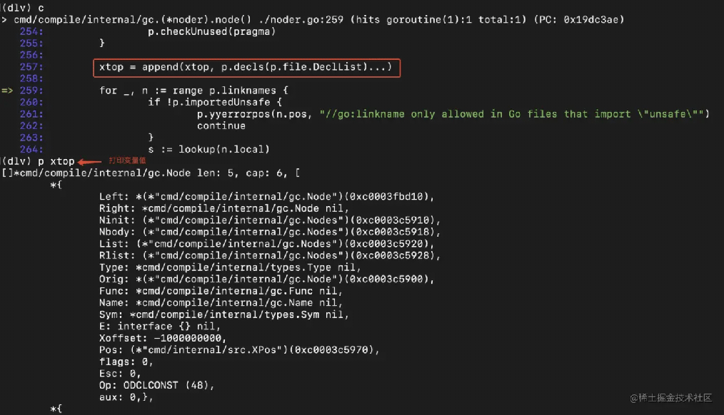 下边利用dlv来调试Go编译过程中的抽象语法树构建。我这里没有粘代码,你可以打开源代码对着下边看