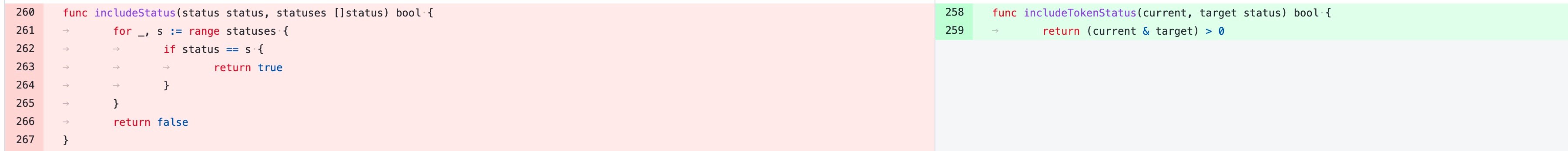 所以优化之前是遍历这个集合来进行判断的,这样的时间复杂度为 O(N),但当我们换成位运算就不一样了,时间复杂度直接就变为O(1)了,同时还节省了一个切片的存储空间。