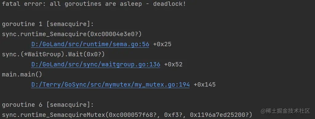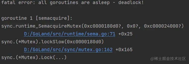 error result:还好有Go的协程死锁检查机制,程序运行后会快速失败而不是一直hang住。