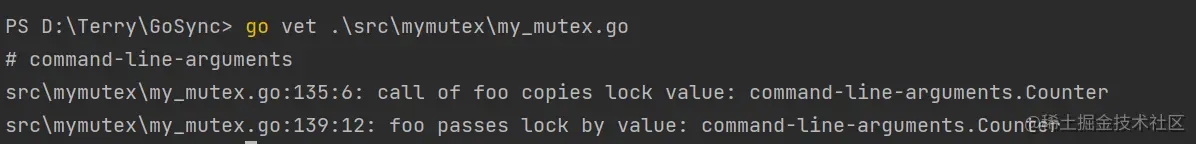 我们当然不想程序运行了才发现死锁,我们可以通过go vet指令来在运行前检查我们的代码是否存在lock copy问题: