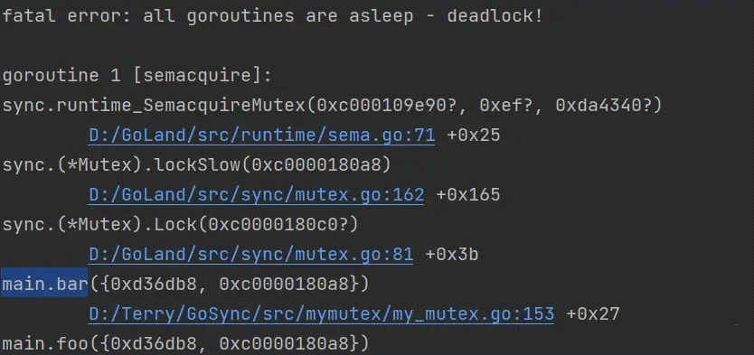 error result:我们可以看到当在bar方法中尝试再次获取锁时,获取不到,触发了死锁。