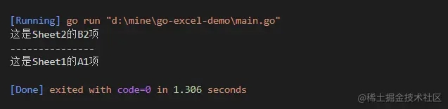 上面做的操作是把我们刚才保存好的表格文件的内容读取出来,这里分了两种形式,一种是用 GetCellValue 方法读取某个sheet的某一项,另一种是用 GetRows 对获取整个sheet的项,然后for循环遍历出来。