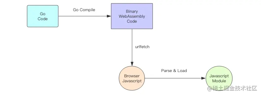 Go 编译器可以将代码编译成 WebAssembly 二进制字节码,被浏览器以静态资源的形式加载进来后转换成 Javascript 模块。有了这个模块,浏览器可以直接操纵 Go 语言生成的二进制字节码逻辑。同时在 Go 语言编写的代码中可以直接读写浏览器里面 Javascript 运行时对象,这样就完成了 Javascript 和 Go 代码的双向交互。