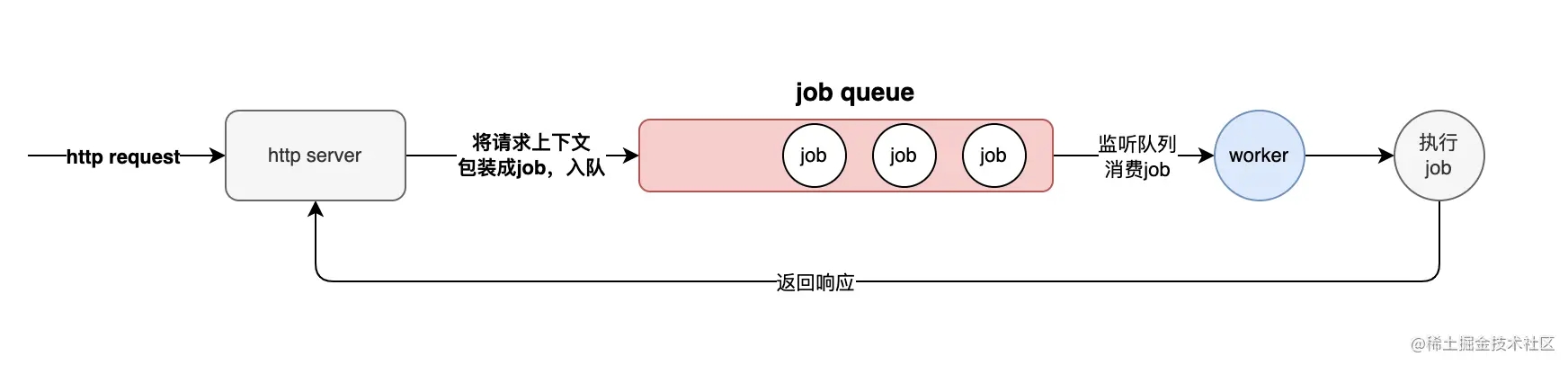 让http请求进入到队列,我们也称为异步处理方式。其基本思想就是将接收到的请求的上下文(即request和response)以及处理逻辑包装成一个工作单元,然后将其放到队列,然后该工作单元等待消费的工作线程处理该job,处理完成后再返回给客户端。 流程如下图:
