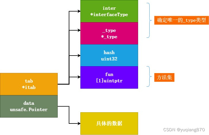 itab是iface不同于eface的关键数据结构。其包含两部分:一部分是唯一确定包含该interface的具体结构类型,一部分是指向具体方法集的指针。其具体结构为: