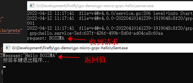 hello.pb.go 中是输入输出数据类型的Golang定义,hello.pb.micro.go 中是go-micro客户端和服务端的gRPC代理程序。