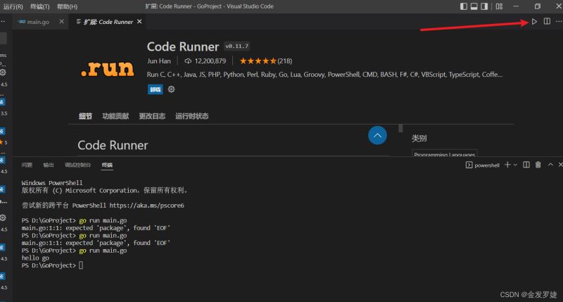 总是这样在终端输入有些麻烦,我们可以下载一个Code Runner,这样点击右上角的三角形状的按钮就可以直接运行了。