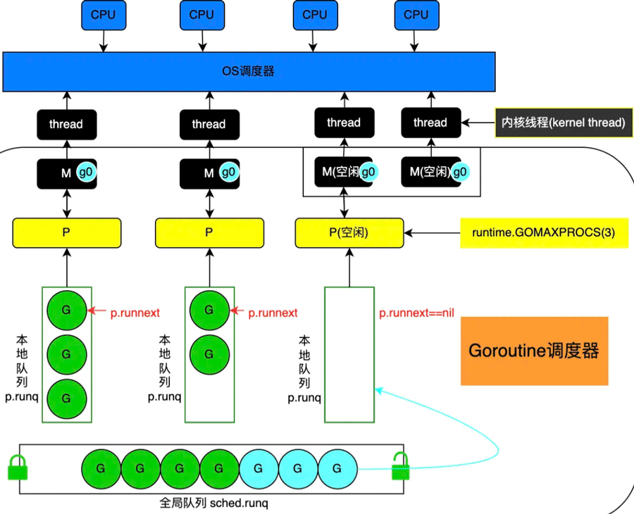 p中还有一个特殊的runnext字段,用于标识下一个要执行的协程g,如果p.runnext不为空,则会直接执行runnext指向的协程,而不会再去p.runq数组中寻找。