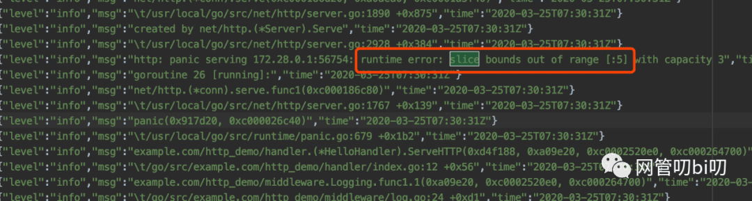 在上面处理函数中,通过切片表达式越界故意制造了一个运行时错误,打开error.log后能看到文件里已经记录到这个运行时错误及其Stack trace