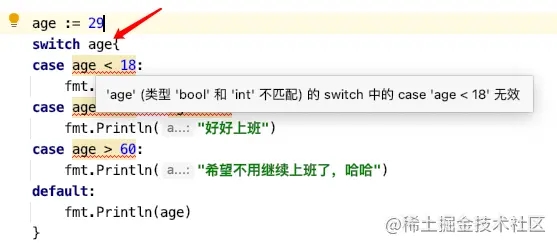 注意:当在case后加判断时,switch后面不需要传入参数,否则会报错:类型不匹配。