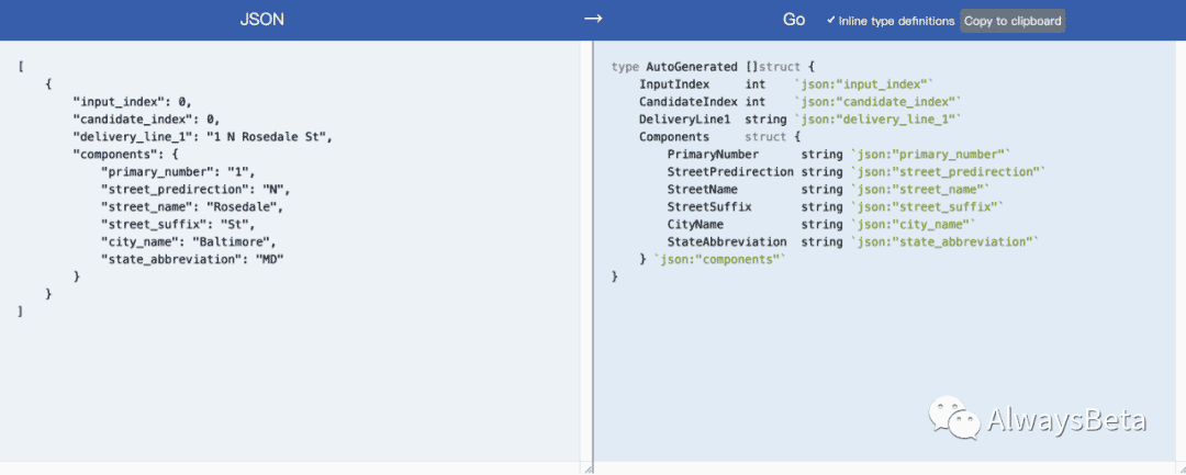 地址:https://mholt.github.io/json-to-go/