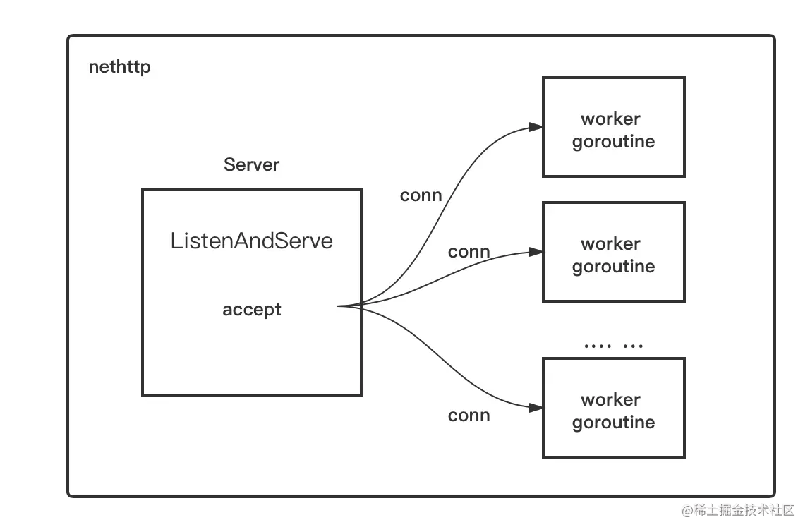 http包作为server端的原理很简单,那就是accept到一个连接(conn)之后,将这个conn甩给一个worker goroutine去处理,后者一直存在,直到该conn的生命周期结束:即连接关闭。