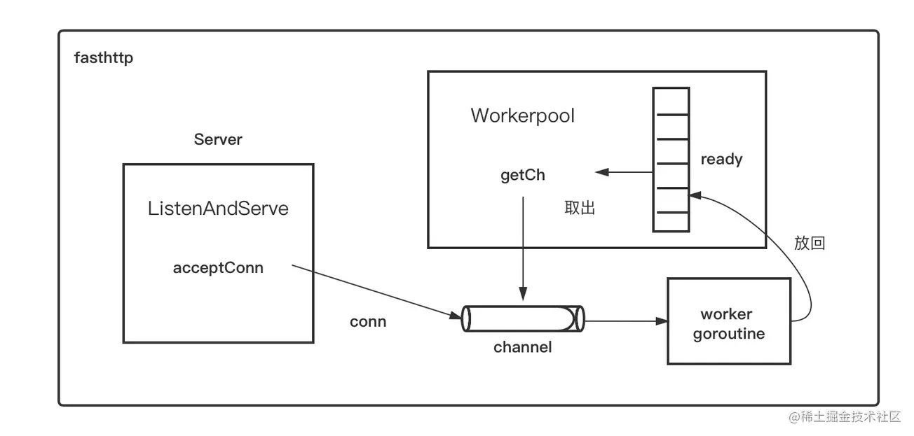 而fasthttp设计了一套机制,目的是尽量复用goroutine,而不是每次都创建新的goroutine。fasthttp的Server accept一个conn之后,会尝试从workerpool中的ready切片中取出一个channel,该channel与某个worker goroutine一一对应。一旦取出channel,就会将accept到的conn写到该channel里,而channel另一端的worker goroutine就会处理该conn上的数据读写。当处理完该conn后,该worker goroutine不会退出,而是会将自己对应的那个channel重新放回workerpool中的ready切片中,等待这下一次被取出。