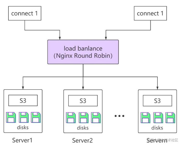 MinIO集群采用去中心化无共享架构,各节点间为对等关系,连接至任一节点均可实现对集群的访问。在我们的方案中还选择了Nginx的轮询实现各个节点的负载均衡。