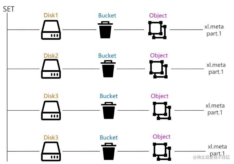 一组 Drive 的集合,分布式部署根据集群规模自动划分一个或多个 Set ,每个 Set 中的 Drive 分布在不同位置。一个对象存储在一个 Set 上。
